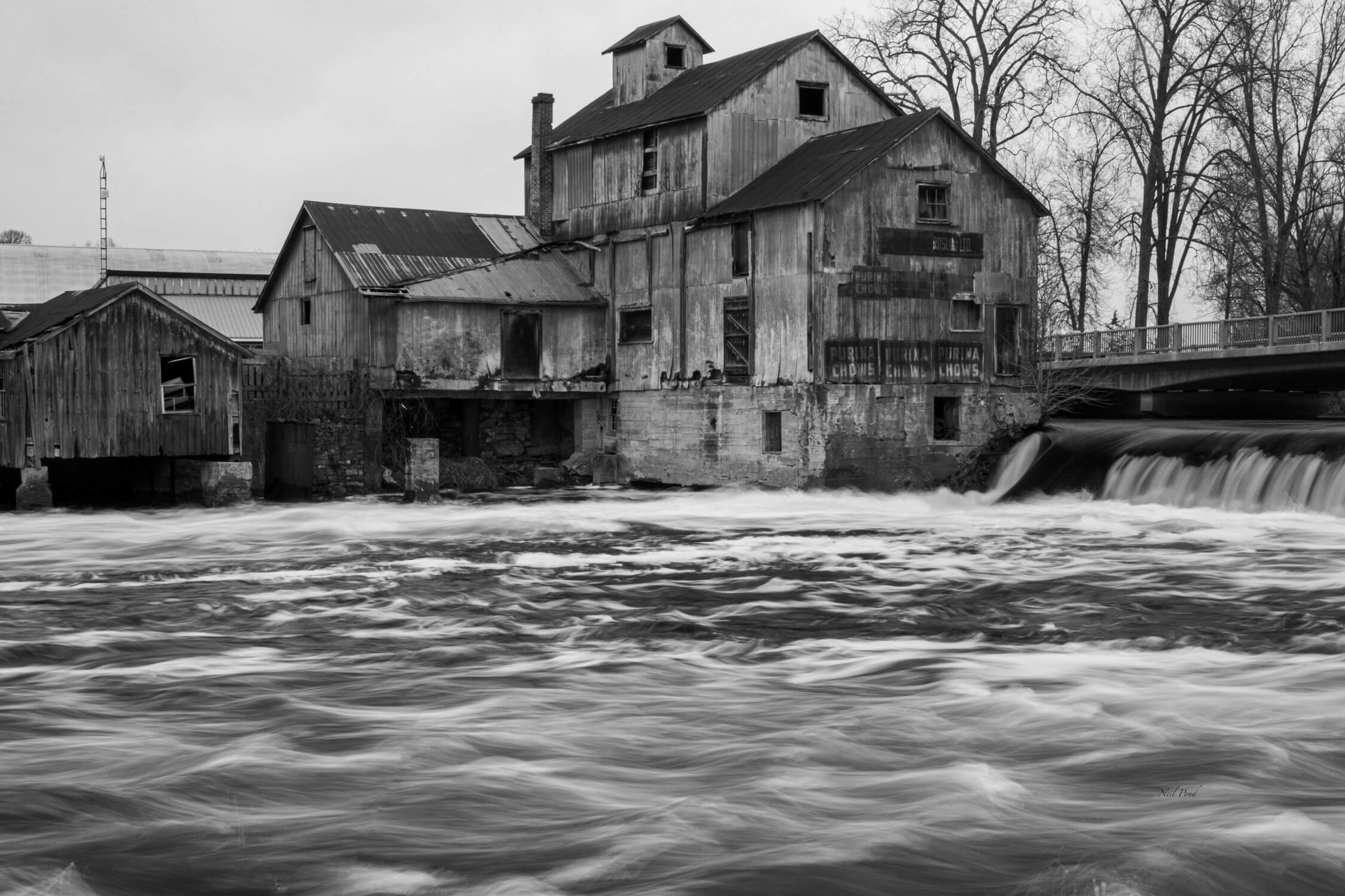 This black and white capture fits the era of the mill, built in 1851 near Roslin, Ontario. Once a feed/flour mill and a sawmill, it has become a major lumber operation on the Moira River operated by the Chisholm family for many generations.